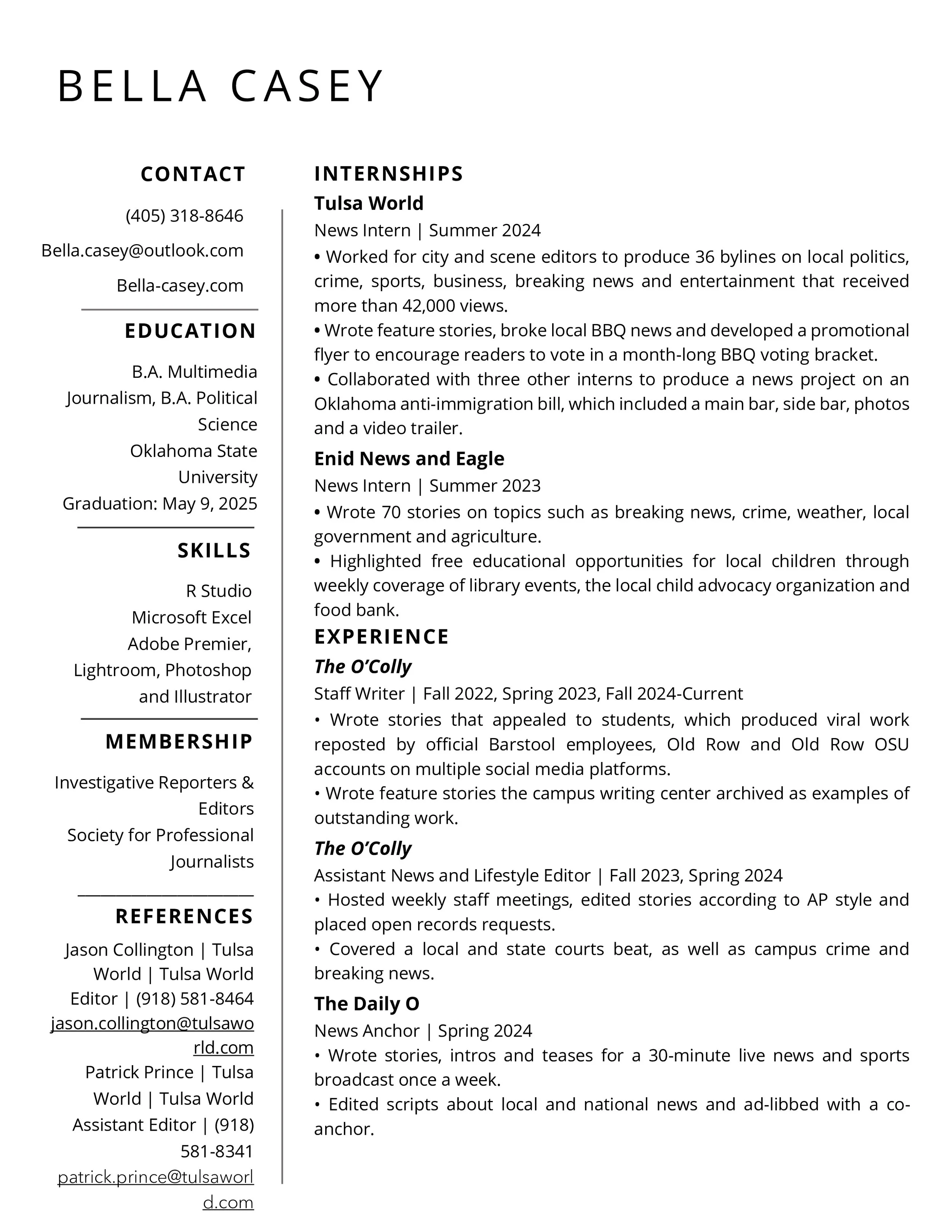 I cover politics, crime, breaking news and everything in between that piques my interest. I added a second degree plan in political science halfway through college to gain an unbiased, educated perspective on the topics I covered, and I owe my journalism experience to newsrooms, not classrooms. I’ve been a natural at writing, but I learned journalism is about so much more. The bright blue O’Colly newsroom became my sanctuary during hard times, and I could escape reality as long as I had my Tulsa World press badge around my neck. Read more about it in my column for the Oklahoma Press Association here.